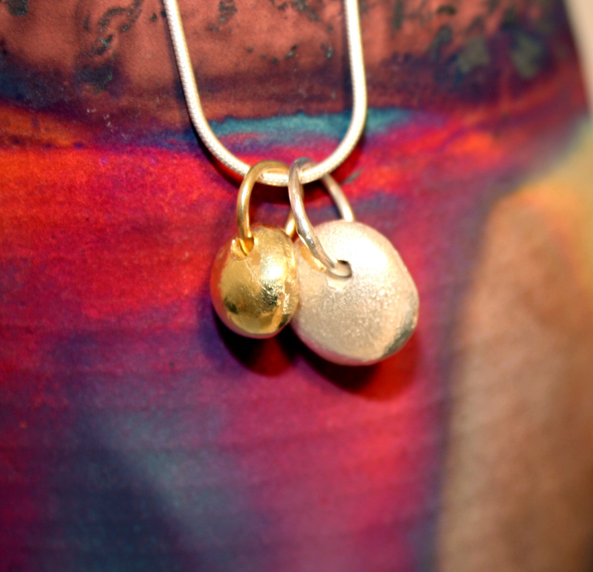 A solid silver nugget charm alongside a solid 18ct gold nugget charm on an 18inch chain.